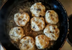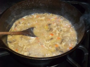 When the meat is cooked, fish it out and put on a plate and strain the stock into a jug. Give the pan a quick wipe with a cloth and put it back on the heat along with the oil. When good and hot add the onions and garlic keep them moving in the pan and after three or four minutes, add the mushrooms. Fry for until the onions are tinged with brown. Now add the stock back to the pan along with the carrot and leek and bring to boil, and reduce the stock by around half its volume.