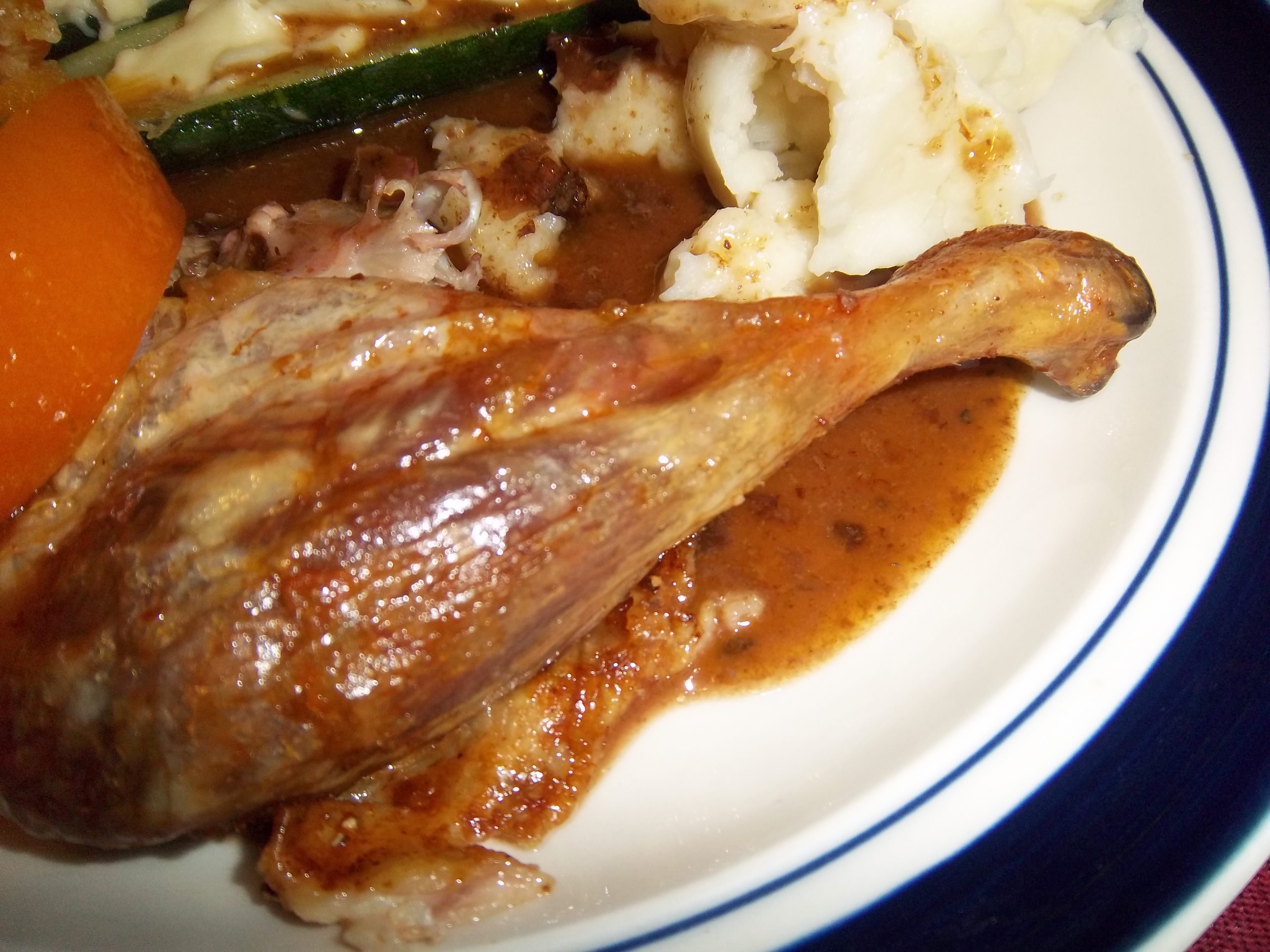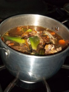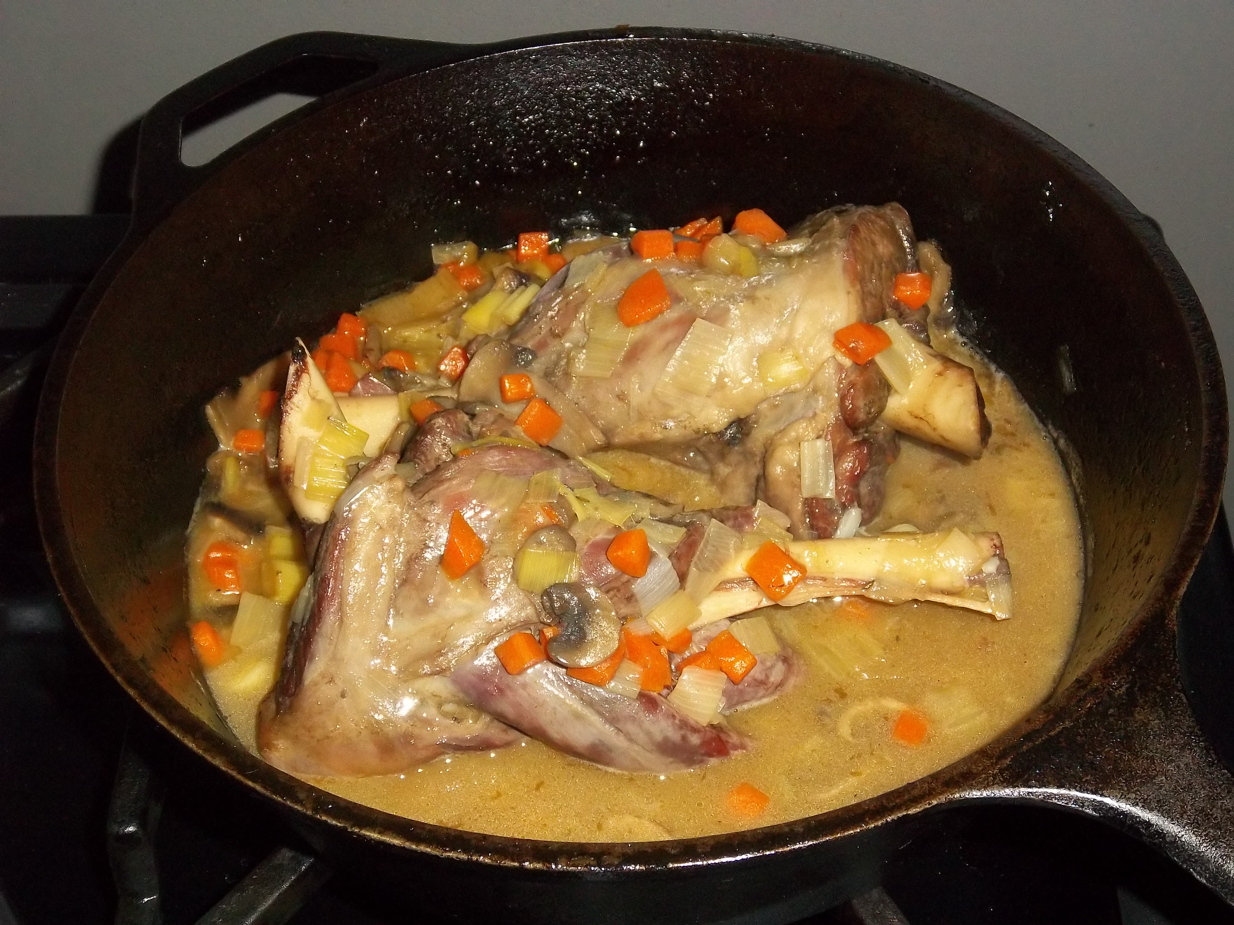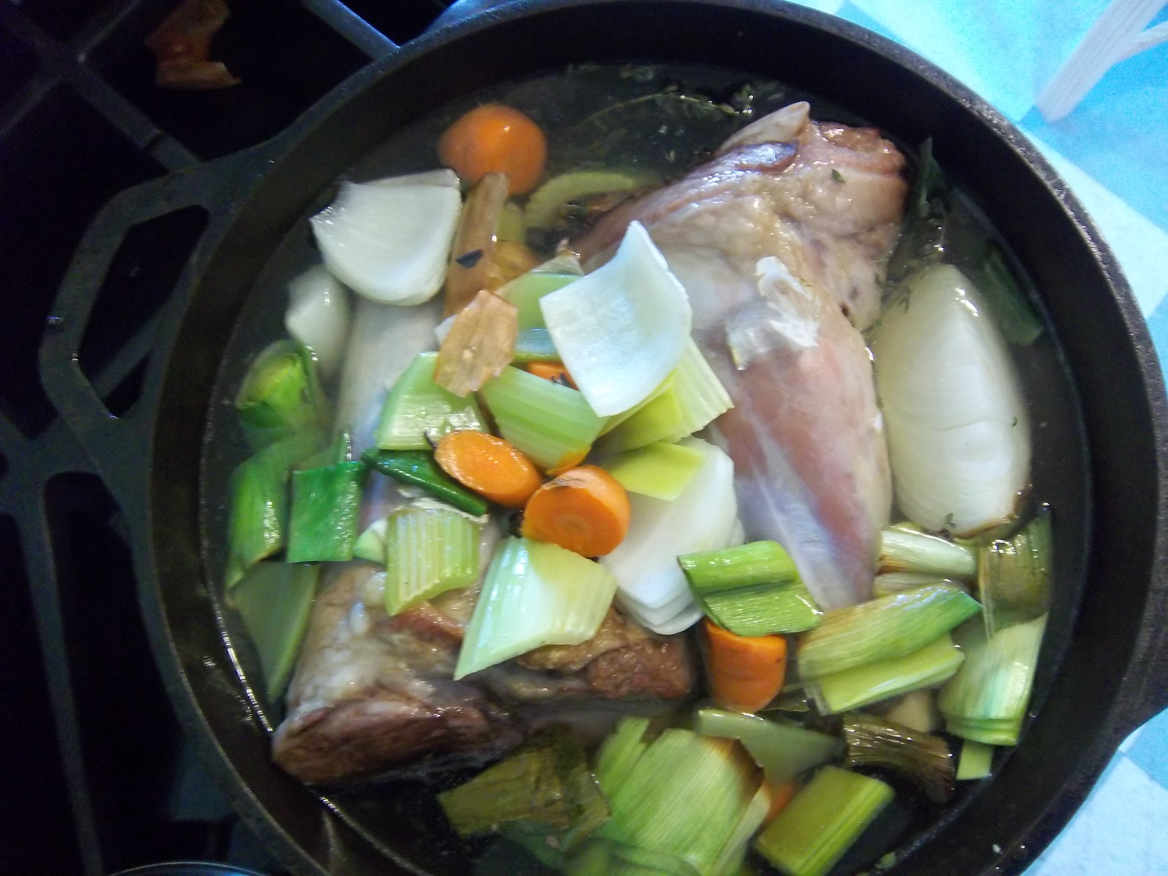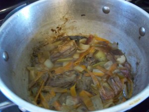 Pour the nice burnt bits along with the wine or water into the pan. Add water to almost cover, bring to a boil and simmer with a close lid for three hours.