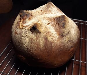 Slash the top of the loaf with a sharp serrated knife to make a cross shape and place in a cold oven. Set the oven to 220°C and once the oven has got up to temperature, bake for 15 minutes. Turn the temperature down to 200°C and bake for a further 15 – 20 minutes, until brown and crusty. Check the loaf is cooked by knocking its underside and listening for a hollow sound. Cool on a rack and listen carefully for the sound of the crusts cracking!