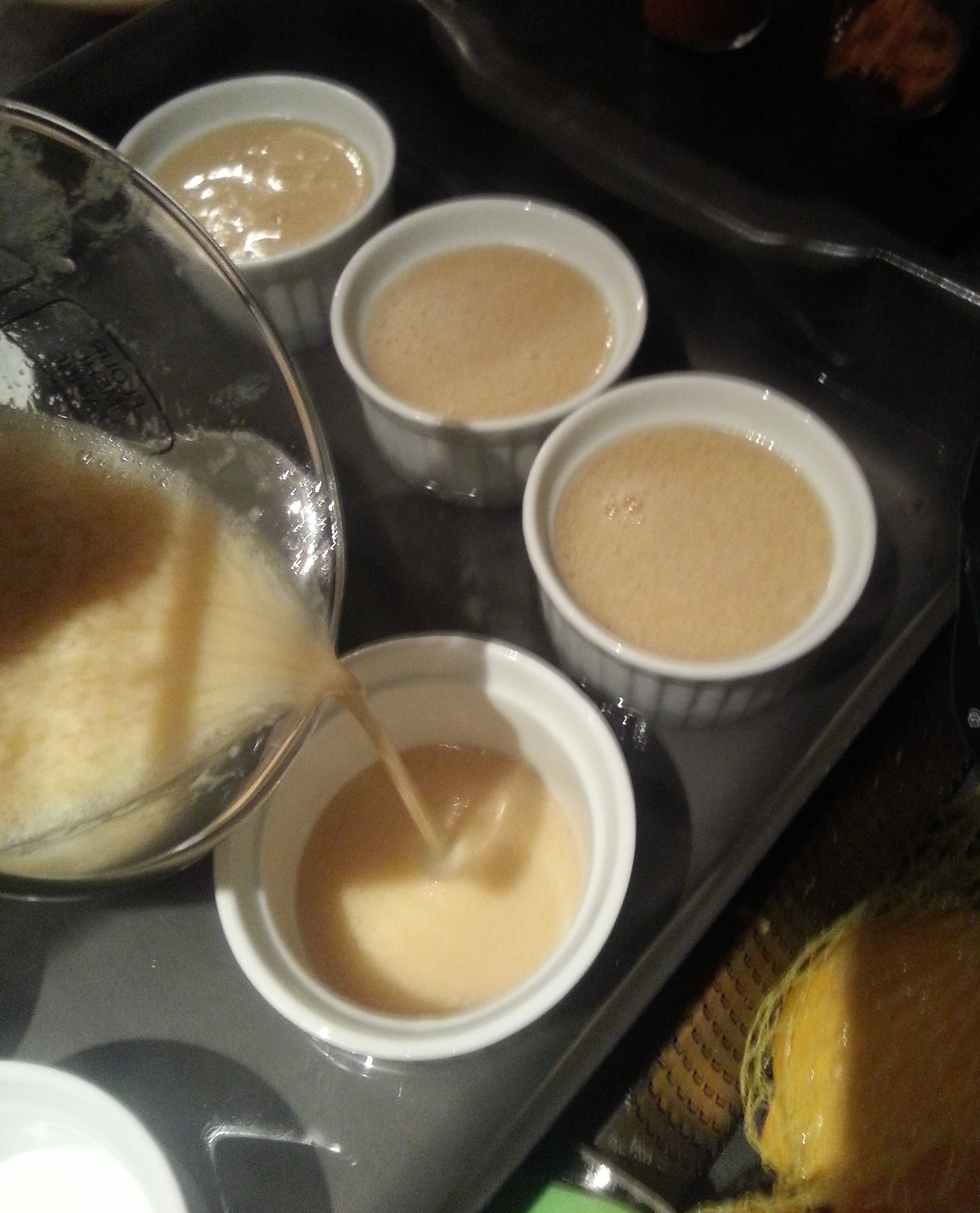 Place your ramekins in a deep roasting tin and pour the custard into them and cover them with foil. Pour boiling water into the tin, technically turning it into a ban Marie. Carefully slide the tin into an oven already preheated to 180⁰C and bake for 12 to 20 minutes, or until the custards are just set and still have a good wobble on them. Serve straight away.