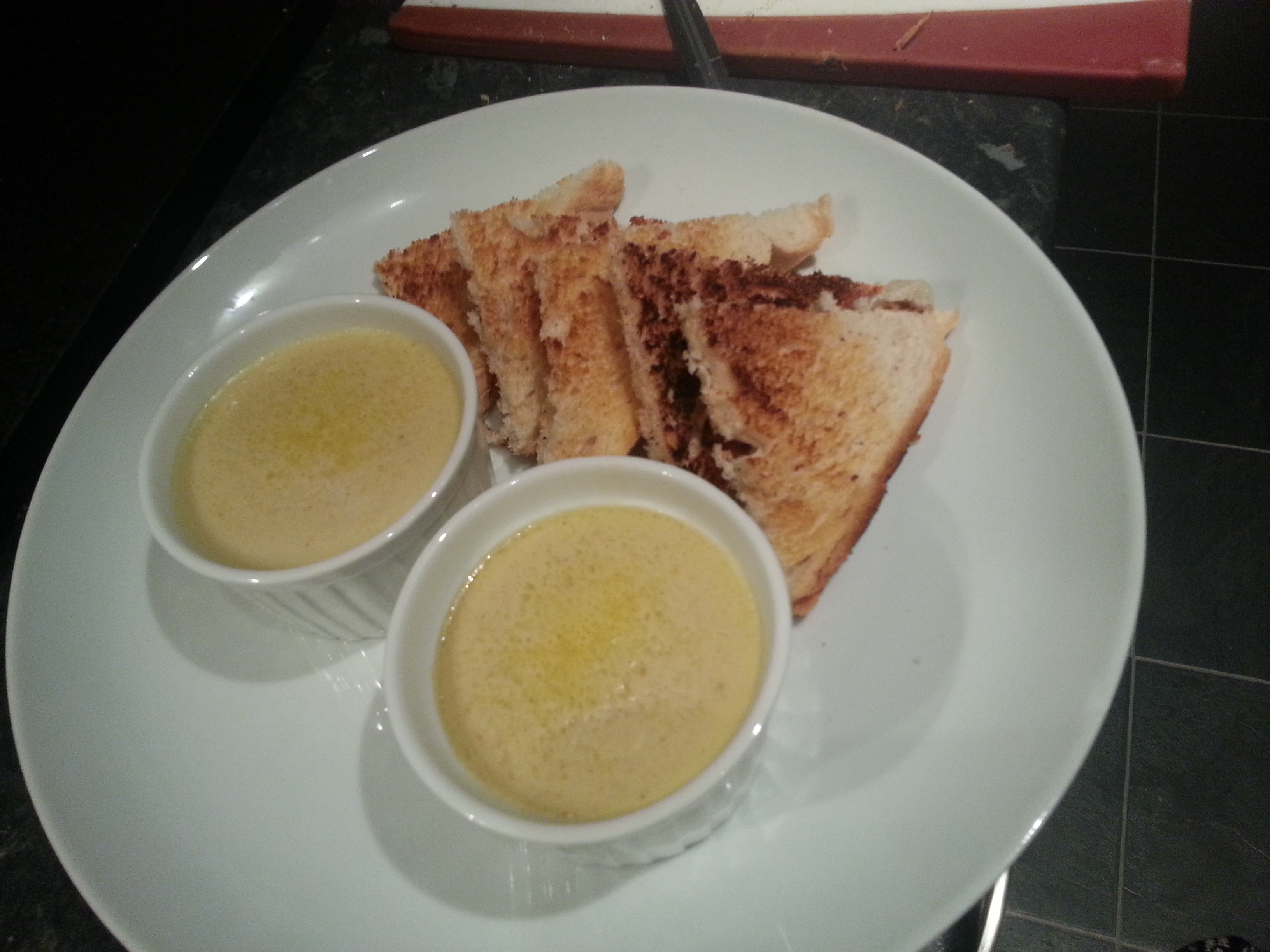 This recipe is in essence a savoury custard, and may sound odd, but it is in fact subtle, delicious and light. It could only work with a home-made stock though. I imagine it would be excellent nourishing food for someone that is ill. The little custards can be served in their ramekins or turned out onto a plate.