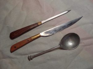 By way of cutlery, only a spoon and knife were available. You usually brought your own personal cutlery. Forks, by the way, were work of the devil. Knives could be used to stab large pieces of meat so it could be torn by the incisors. This tearing of food meant that top incisors wore away so that the they met perfectly in middle, unlike we modern Westerners who all have overbites because most of our food is cut up!