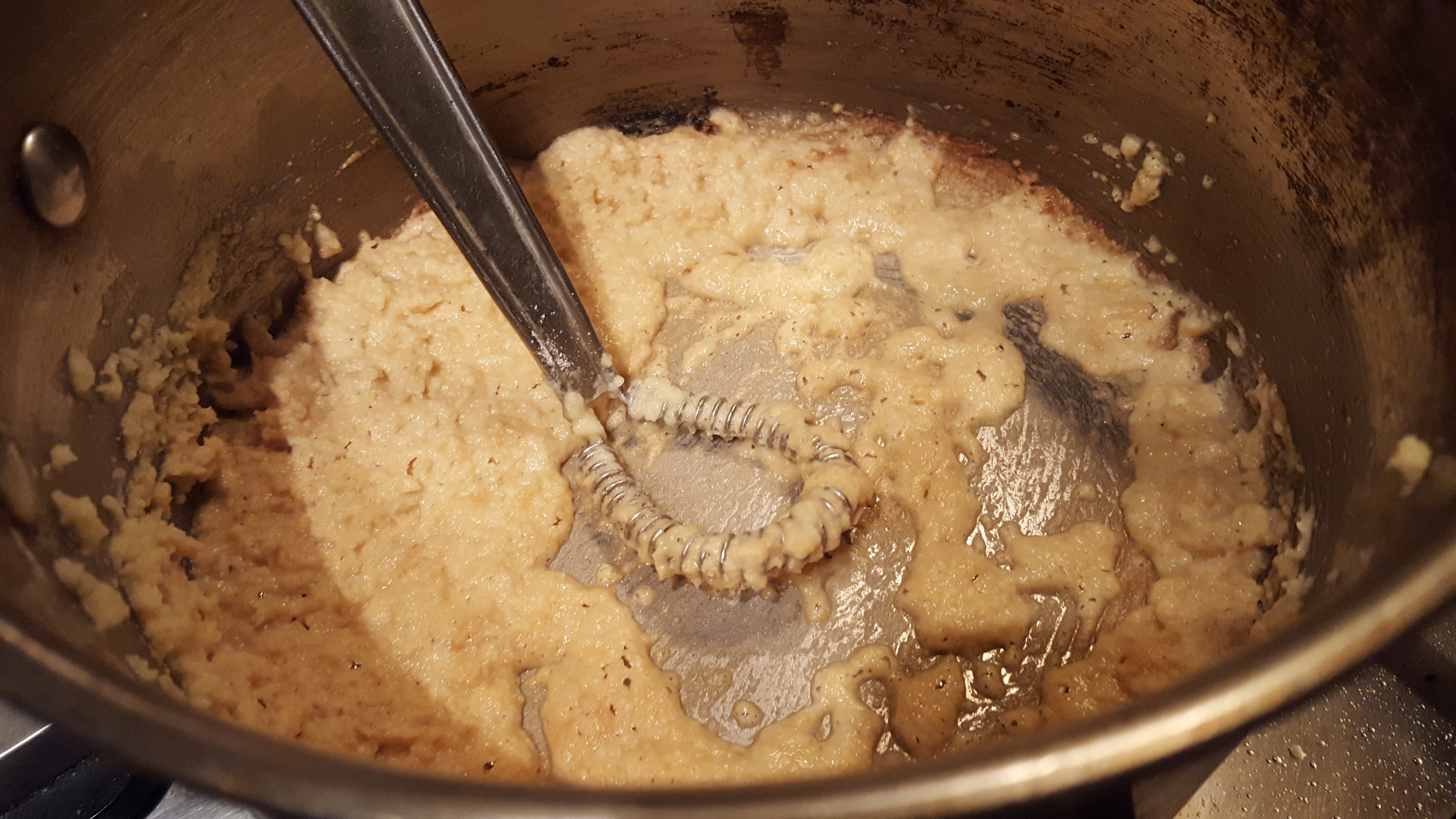 Using a small whisk, beat in around one third of the ale. Once smooth, add another third and beat again before mixing in the last of it. To avoid lumps, make sure the ale is fully mixed into the roux before adding. Simmer gently for a few minutes, beating occasionally.