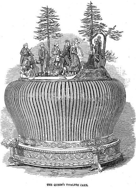 The focal part of the Twelfth Night side-table was the elaborately-decorated Twelfth cake, essentially a rich fruit cake containing brandy, covered in a layer of rock-hard royal icing, the top groaning under the weight of sugar figures and other intricate sculptures and piping. Inside each Twelfth cake a large dried bean or pea would be baked; on the big day those who discovered them would be proclaimed king or queen for the rest of the day.