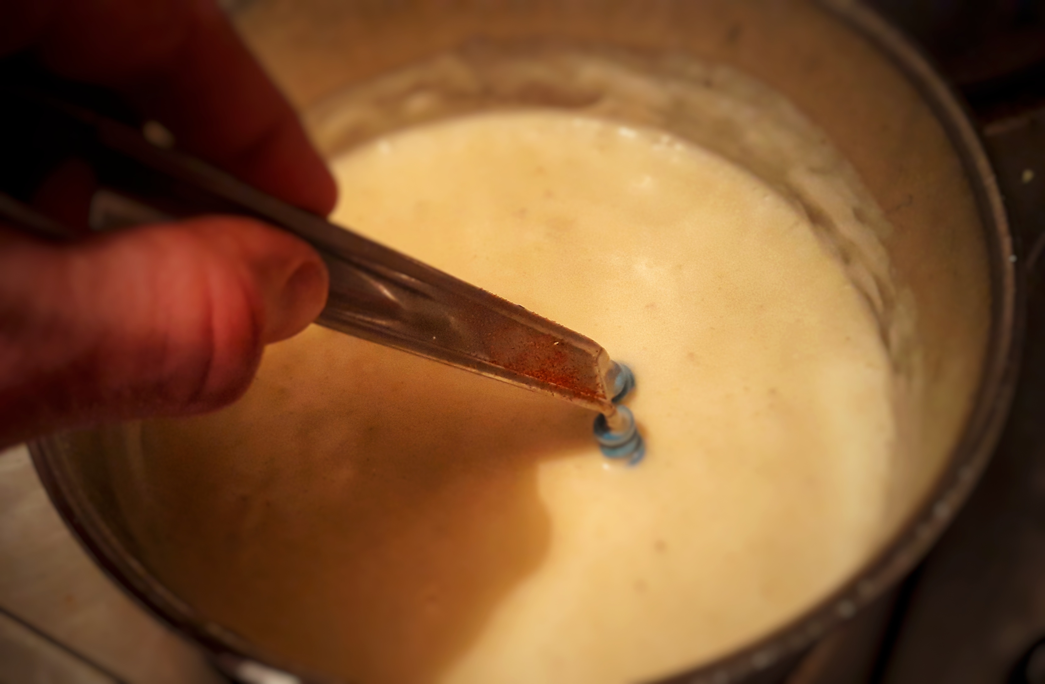 Beat in around a quarter of the milk with your whisk, adding another quarter once the first lot is fully incorporated. Repeat until all of the milk is used up. Add the cream and allow the béchamel sauce to simmer gently for around 10 minutes. Make sure you stir every minute or so, to stop the flour sticking to the bottom of the pan.