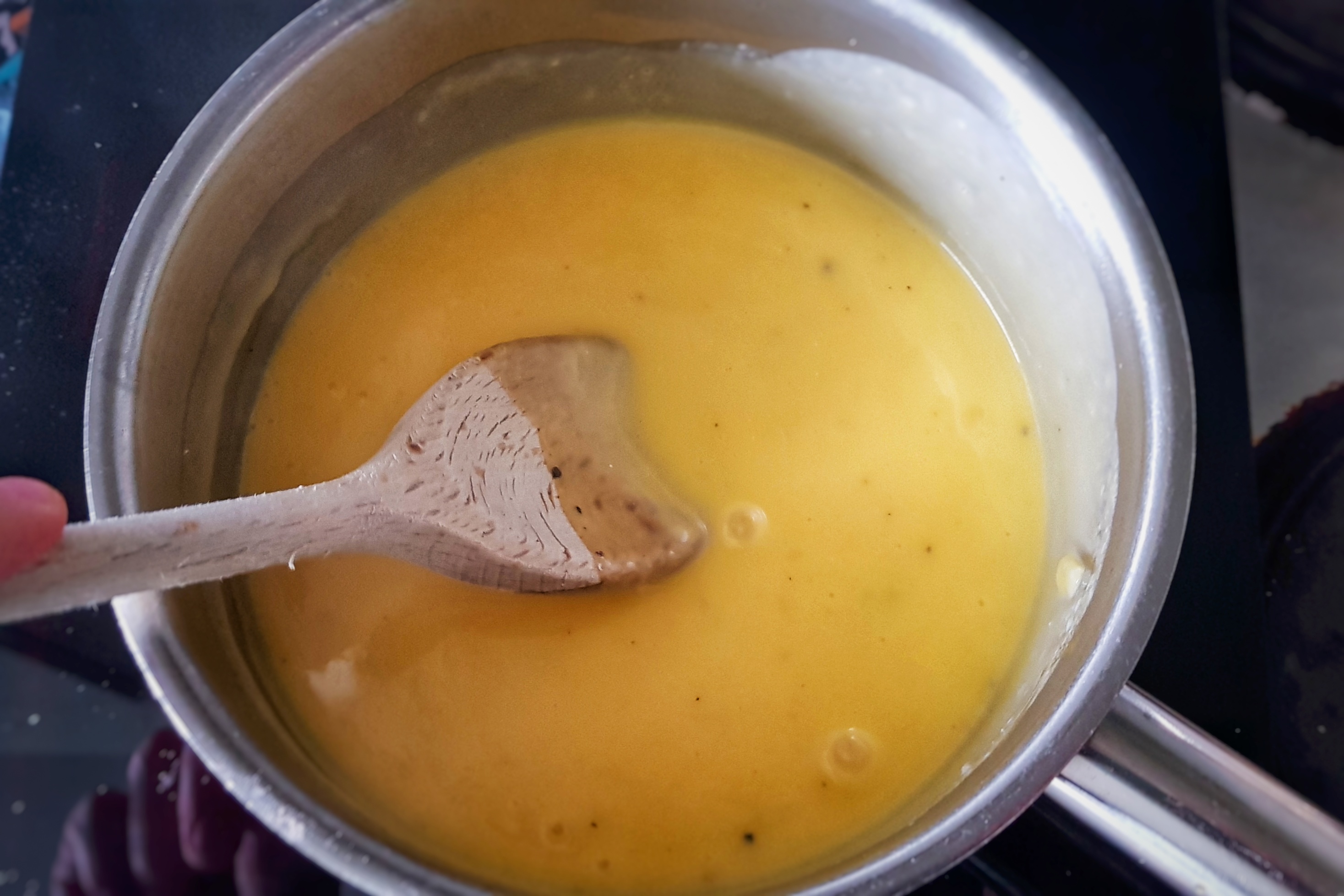 When the sugar has dissolved, turn up the heat to medium. It’s a bit like making custard now, but the heat can be higher: keep stirring until the beestings thicken – as if by magic – as it comes to a simmer.