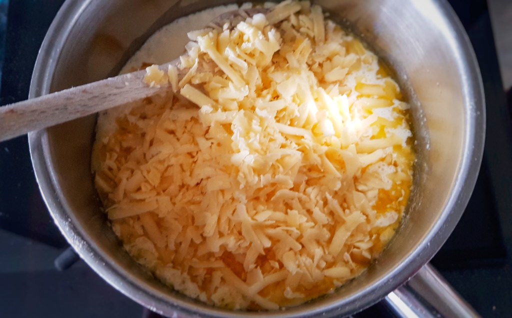 Remove from the heat and mix in the cheddar and seasonings except the salt. Taste and add salt if required – usually the cheese and other seasonings are salty enough. Return to a very low heat and stir until the cheese has melted into the smooth sauce. Be careful not to heat it too much as the melted cheese will split.