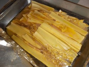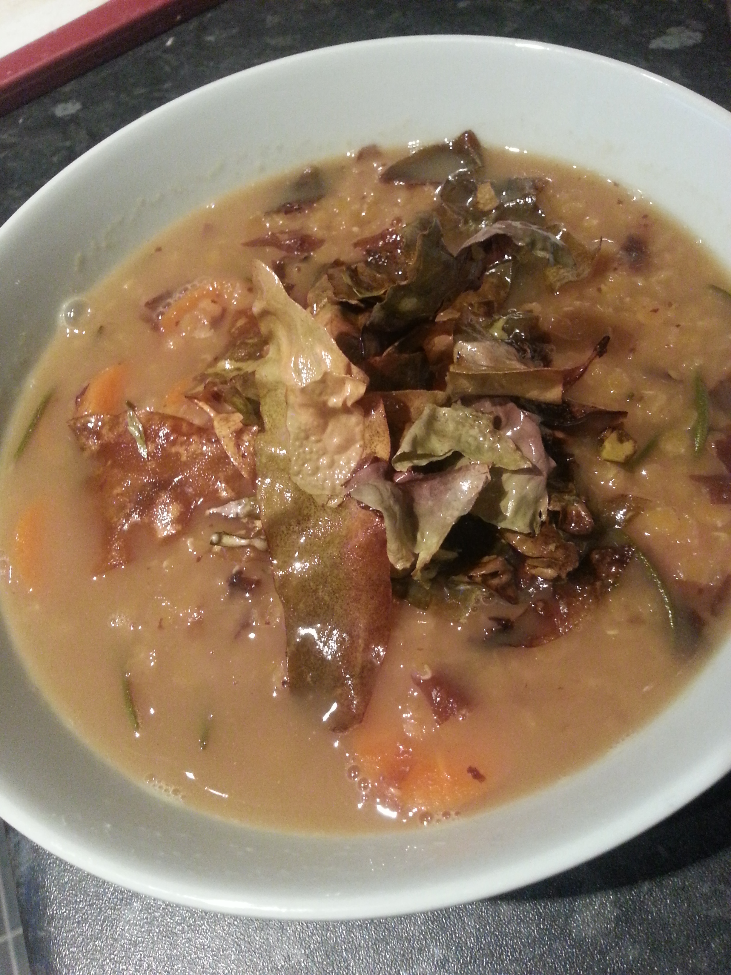 Your pudding needs to be cooked, cooled and set the day before you want to eat it (or several days before if you like). To do this, shred the leaves and add them to a pan with the leek or onion, oatmeal, salt, pepper and water. Bring to a simmer, stirring so that it doesn’t form lumps.