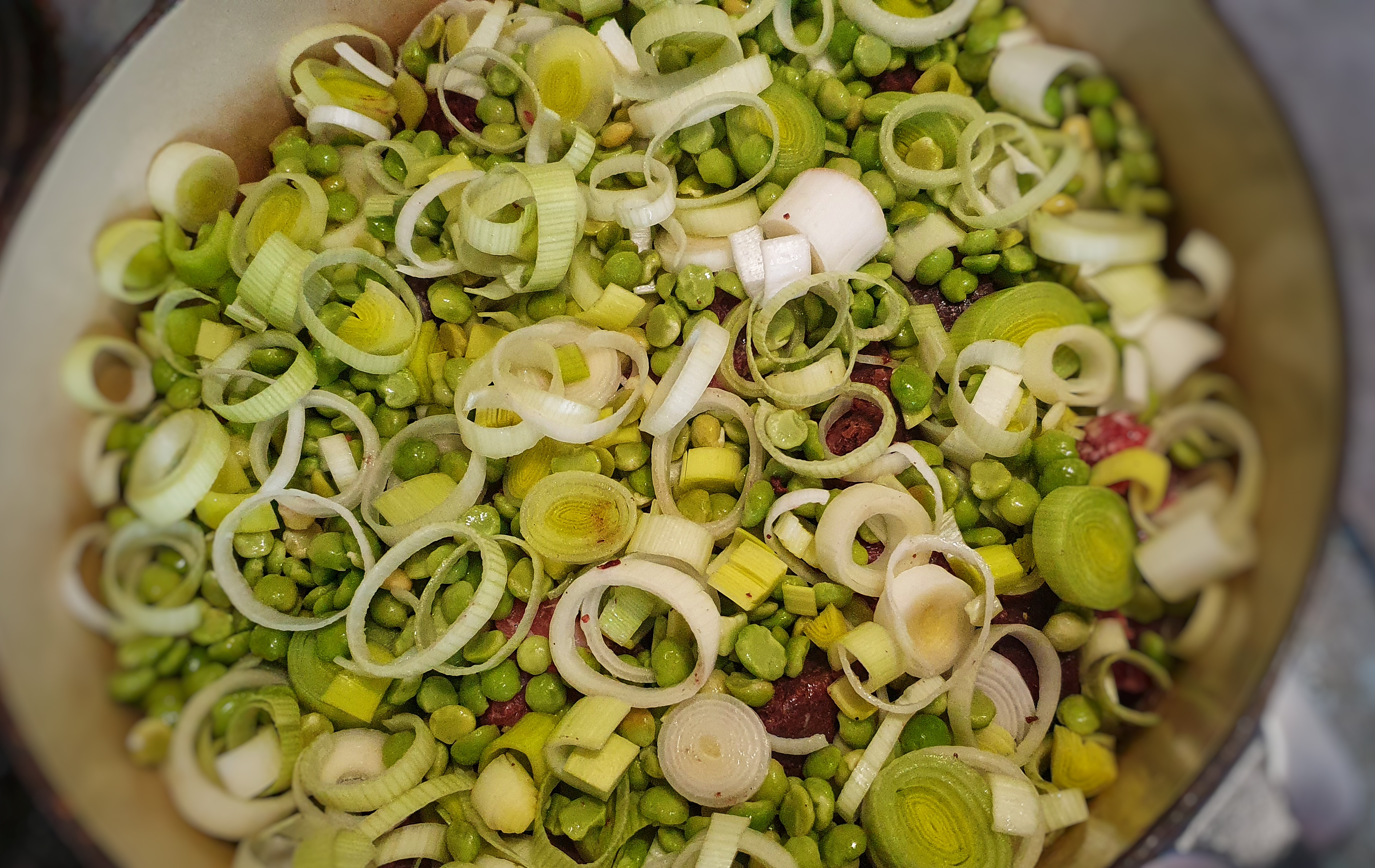 2 onions, peeled and sliced, or 2 leeks, trimmed, rinsed and thinly sliced