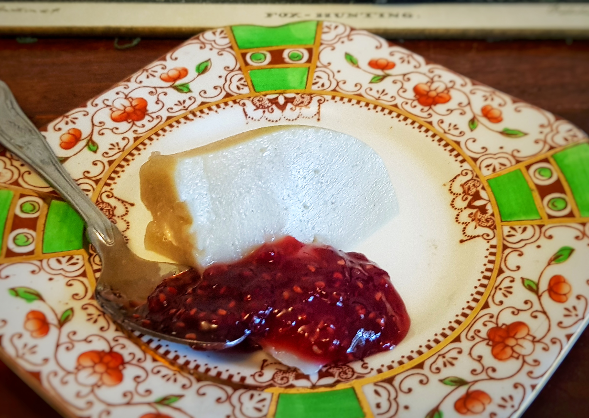 I was very pleased with the results, and I present them for you below. Whether you make the drink, the porridge or the flummery, the basic recipe is the same. It makes 550ml of drinking sowans or around 450 ml of porridge or flummery. I ate the porridge with treacle and milk, and I ate the flummery with raspberry jam, and I enjoyed them both. I think the flummery would be great flavoured with sweetened raspberry purée or orange flower water.