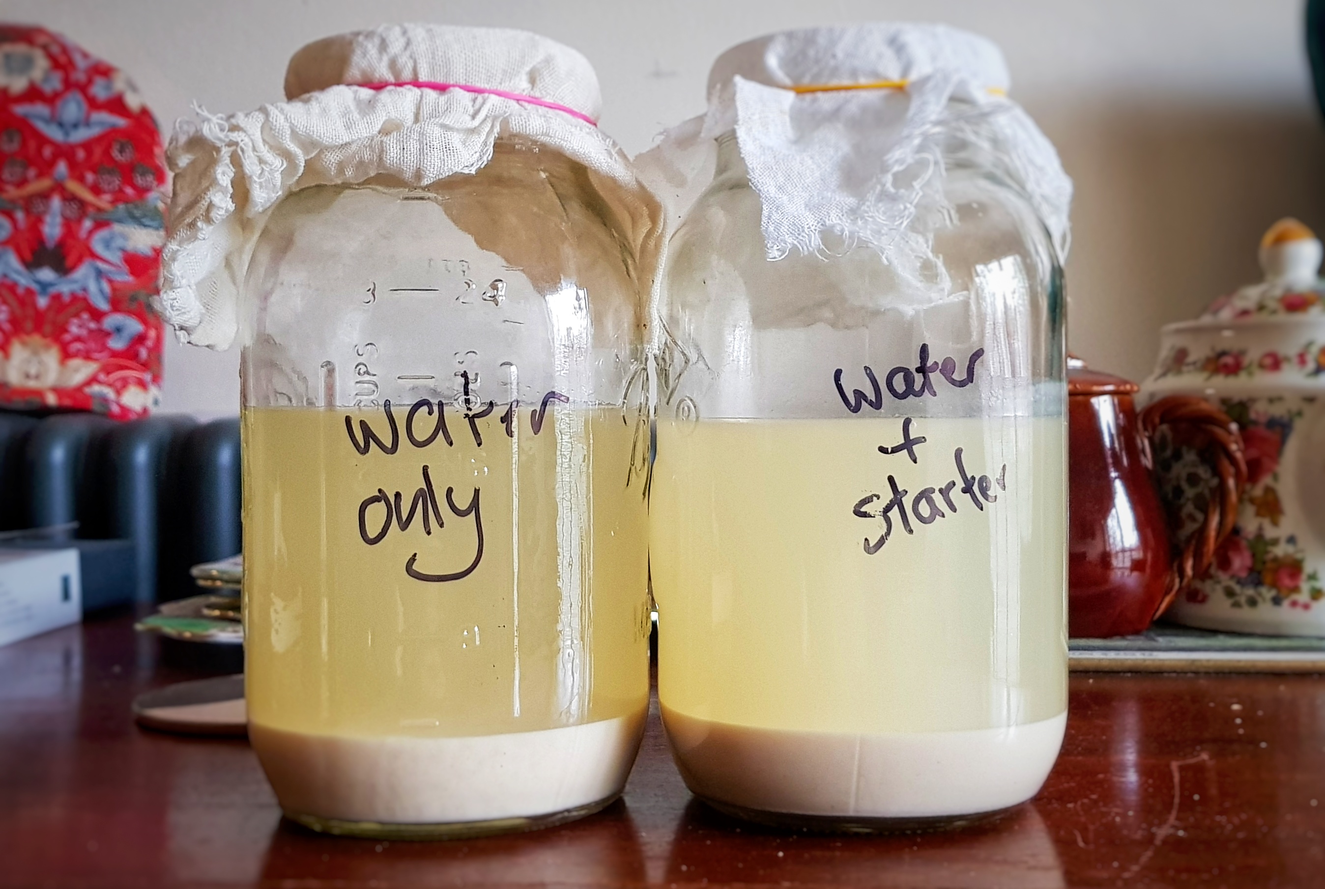Emboldened, I tried again, this time with two conditions: one with water and organic oatmeal and the other exactly the same, except for a couple of tablespoons of the sour liquid from the first experiment, to give the sowans a boost. Note I didn’t use oat husks, and there are three reasons for this: