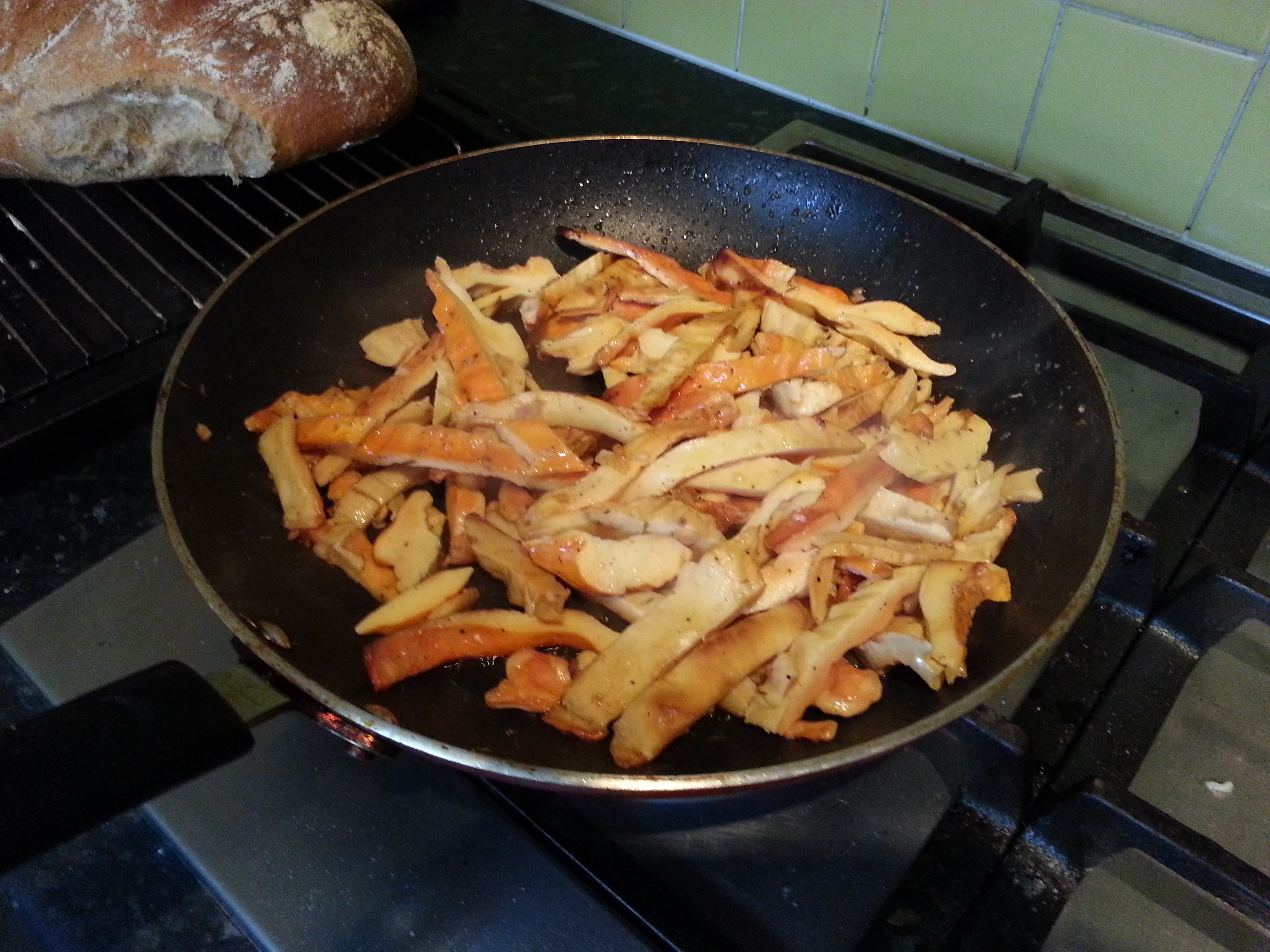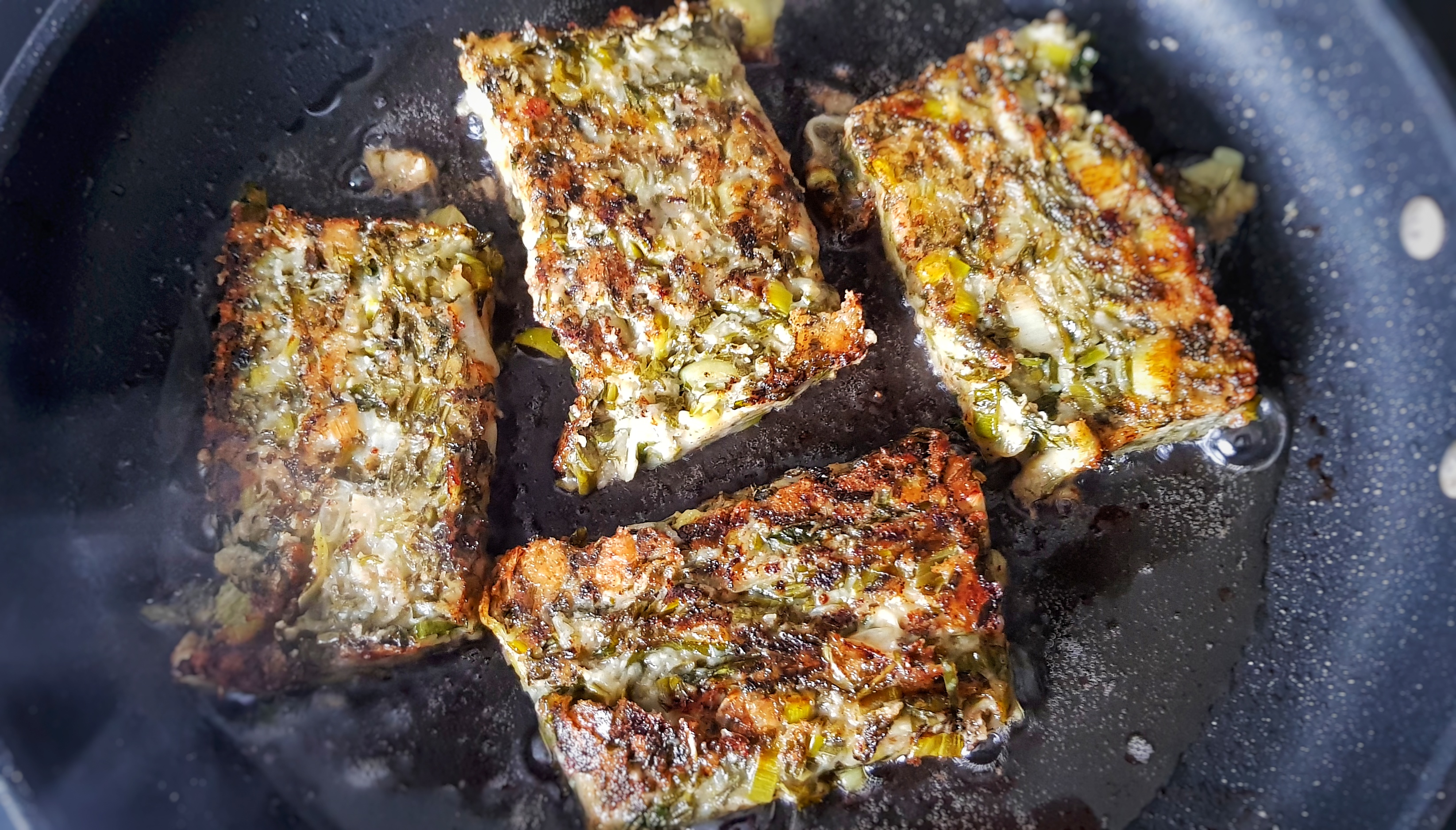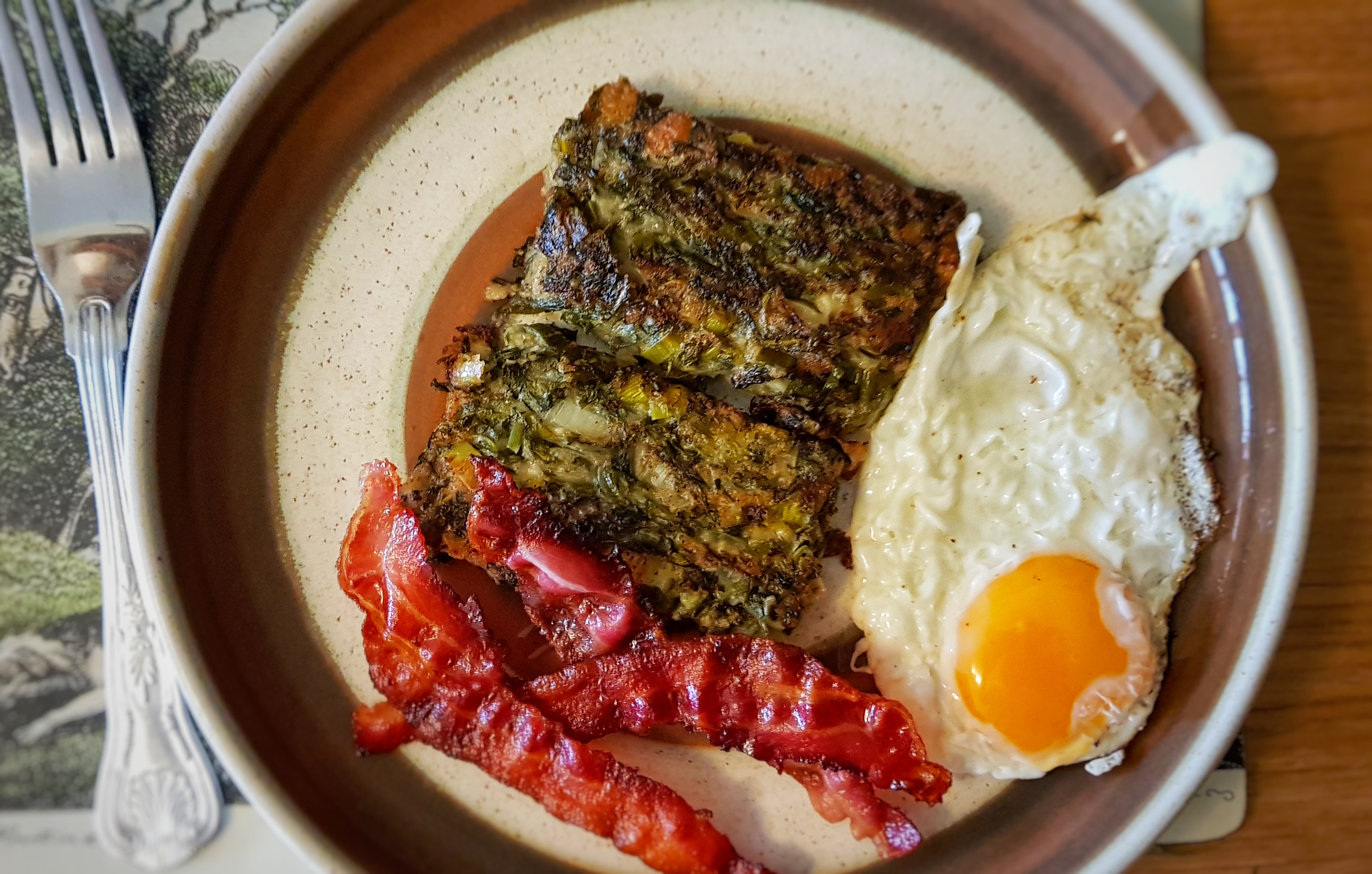 I found a patch of Passion dock growing in the Cheshire town of Lymm last year, but they were far too old and tough to pick, but I remembered this year. Oddly, I couldn’t find any nettles, but I did spot some sorrel and some wild garlic. I was in a bit of a rush, and didn’t have enough to make the very green sort of pudding, but I didn’t want to boil one (to save on fuel), so tried a common trick of cooking it in a saucepan, pouring and setting it in a tub so I could slice and fry it. This method is sometimes used for other savoury puddings such as black pudding or mealy pudding.