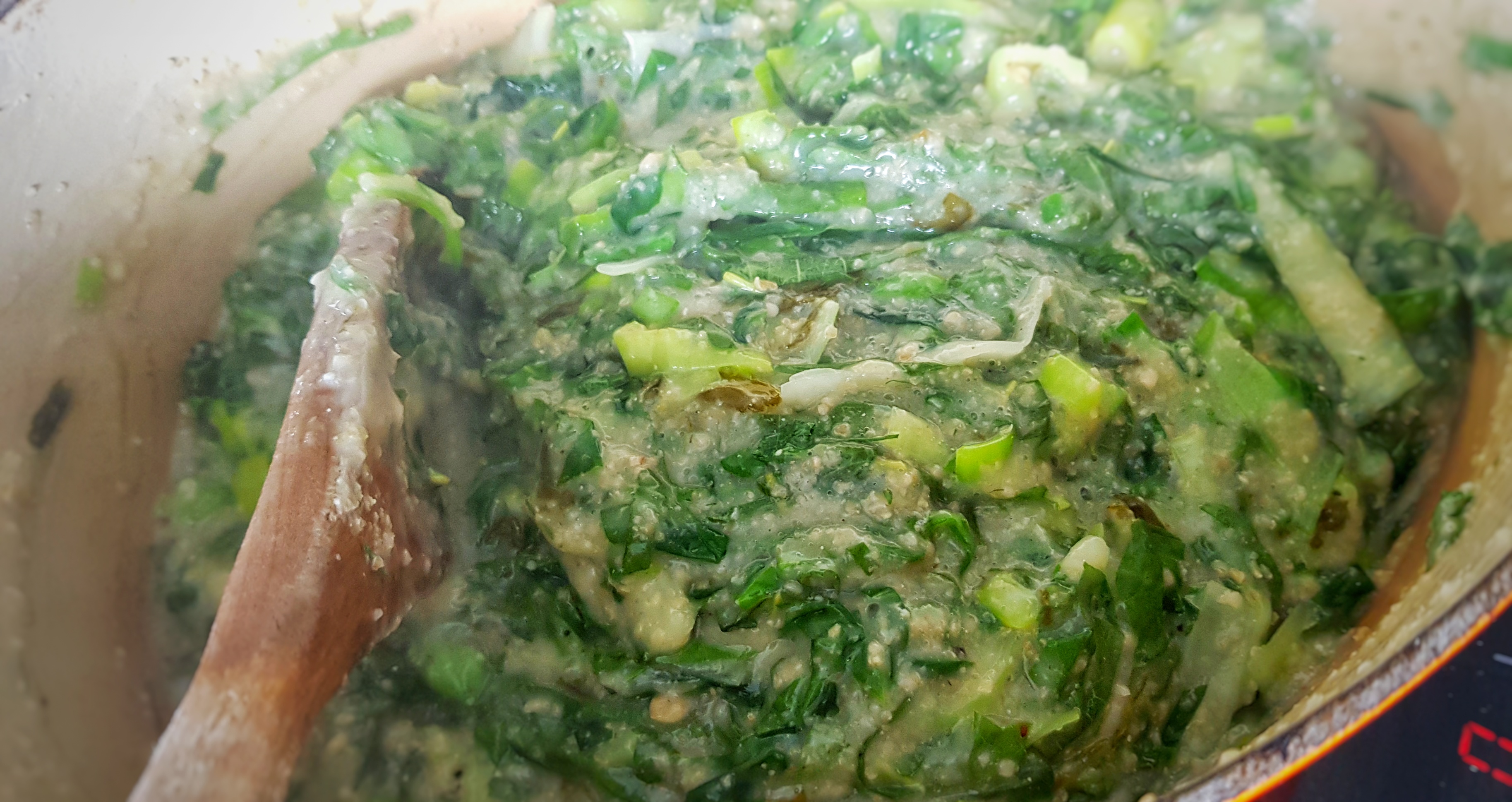 Your pudding needs to be cooked, cooled and set the day before you want to eat it (or several days before if you like). To do this, shred the leaves and add them to a pan with the leek or onion, oatmeal, salt, pepper and water. Bring to a simmer, stirring so that it doesn’t form lumps.