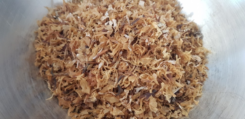Carrageen is a common seaweed found throughout the coasts British Isles, except for parts of Lincolnshire and East Anglia.2 It is found in rockpools, is branched and a dark red colour. The wonderful food writer Theodora Fitzgibbon describes it as ‘a branching mucilaginous seaweed found on all rocks in Ireland’, which does not sound appetising, I realise. She goes on the comfort the reader, telling us that ‘it does not taste at all marine when properly prepared.’3 It is picked and dried in the sun, typically in April and May, and during the process it lightens from a dark red-brown to a creamy brownish beige, tinged with a pink-red hue.