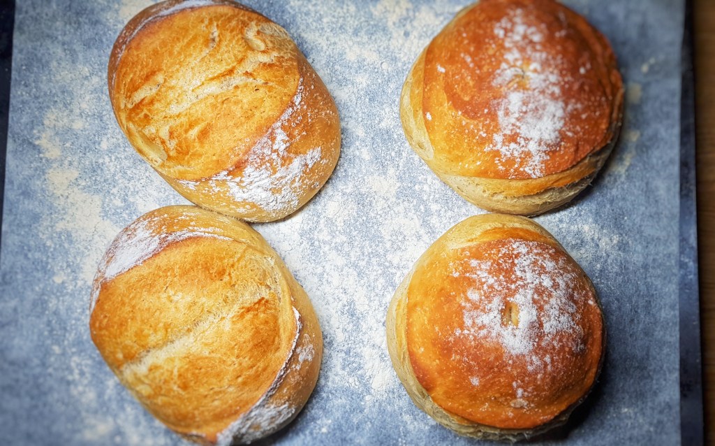 It seems that they were also enriched with milk and/or butter and/or eggs, or none of the above, so perhaps something rather like a brioche (sometimes). Elizabeth took the information and created a flour mix of plain white flour, with some strong white flour and a little wholemeal flour, to replicate the lower gluten, not-quite-white nature of the wheat flour used at the time. She enriched her dough with butter and milk, avoiding egg. It put me in mind of my recipe for Cornish/Devonshire splits. She liked that in some descriptions the loaves were oval in shape. To replicate this, she made a deep slash in the dough before it went into the oven. However, I much preferred the sound of Gervase Markham’s 1623 way of shaping his loaves. He instructs us to take the risen dough and