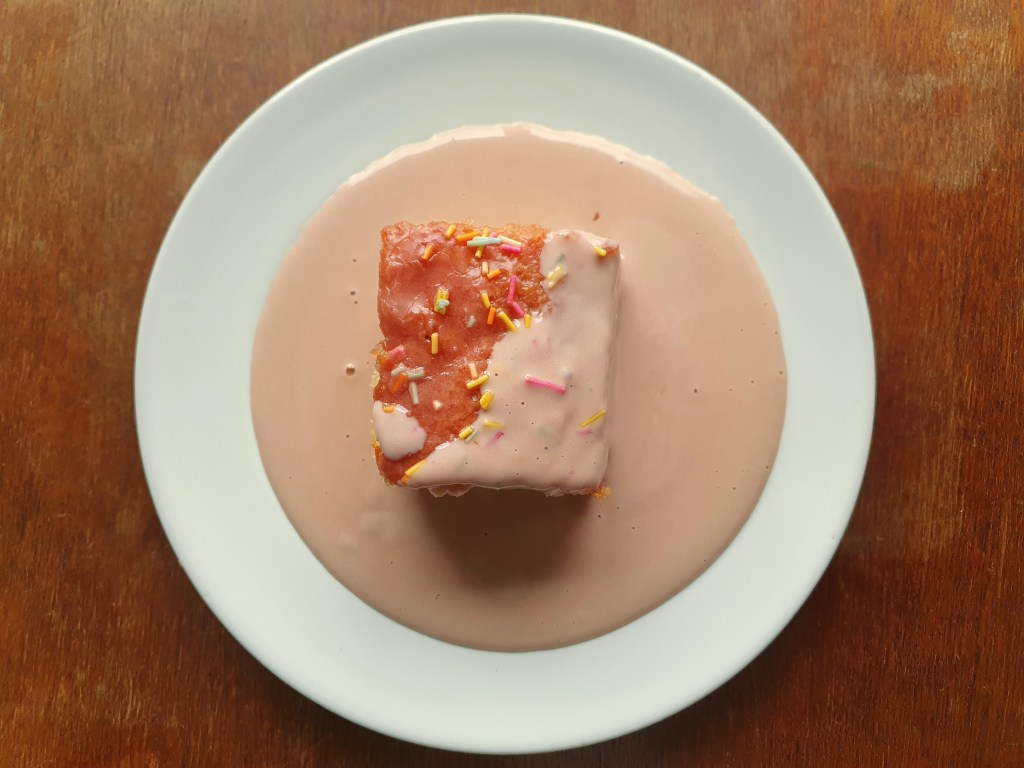 As promised on the ‘School Meals Service with Heather Ellis’ episode of the podcast, I have written a recipe for a stone-cold school dinners classic for my monthly subscribers. I went for the pink-sponge and custard because quite a few people have mentioned this as a favourite on social media, so it was the obvious choice. Heather Ellis said on Twitter that there were several different colours of these sponges: I also remember brown (though I don’t think it was chocolatey, just coloured brown). Others remembered white, and I wondered if yellow was perhaps a colour? Let me know your thoughts/memories.