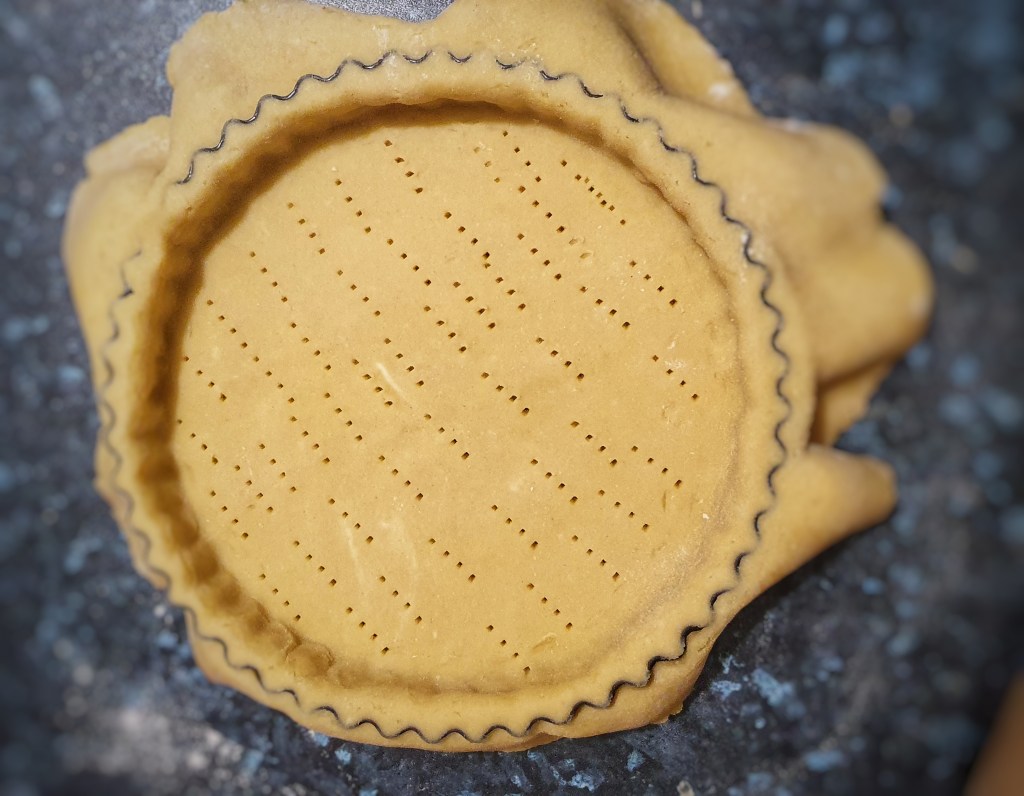 Begin by rolling out the pastry to the thickness of a pound coin (3 mm approximately). Allow to rest for a couple of minutes before lining the tin with the pastry. Make sure the pastry is tucked into the edges properly and that there are no air bubbles. Trim with a knife or rolling pin (whichever is most efficient – depends upon your tin!) and prick the pastry all over with a fork so that it doesn’t puff up too much in the oven.