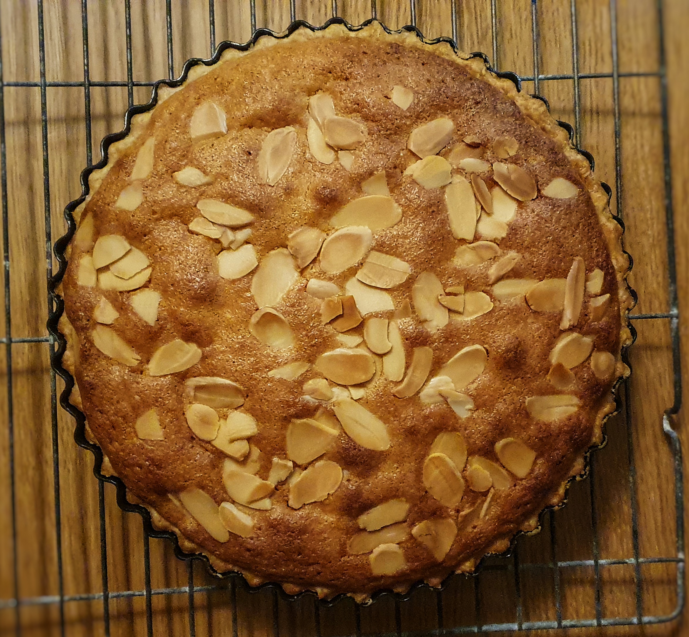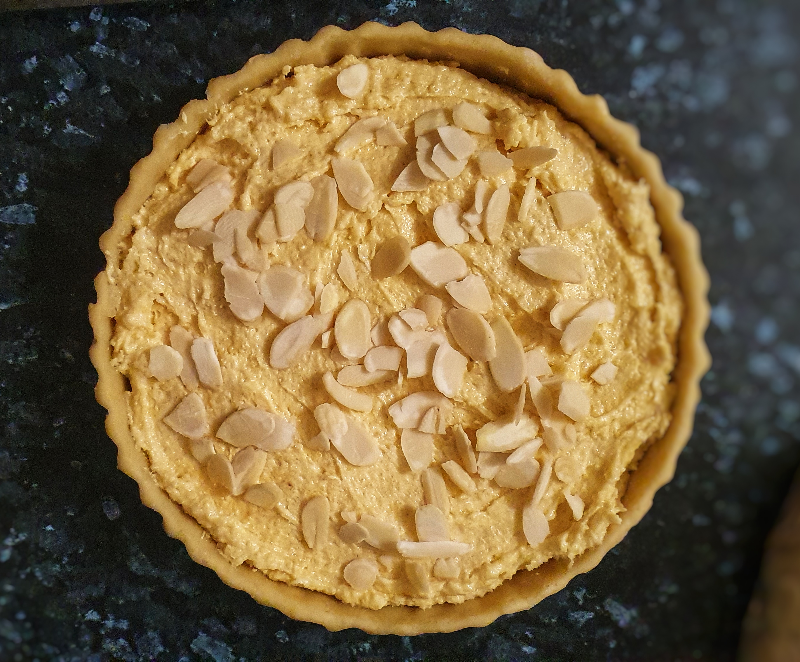 Sprinkle with the slivered almonds and slide the tart onto the hot baking sheet and bake for 40 minutes, turning the heat down to 160°C if the top gets too brown. Cool on a rack, and remove from the tin when just warm.