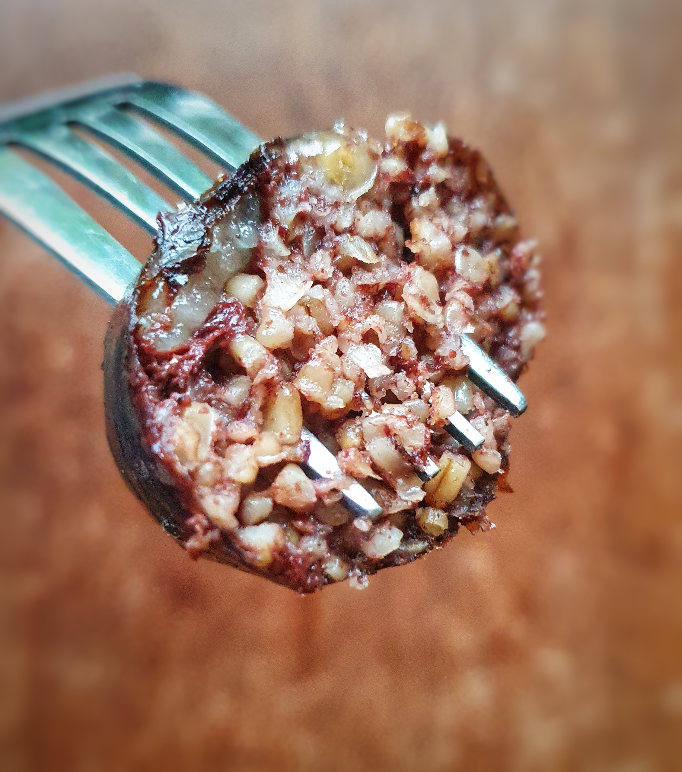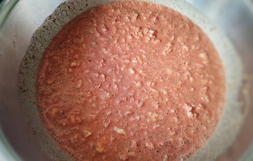 [6] Note: Looking back on these initial stages, it would have been much better to soak the oats in the blood overnight, mix everything together in the morning, let everything meld and mingle for a couple of hours, and then add enough milk to make a mixture of a spoonable porridge consistency. We live and learn.
