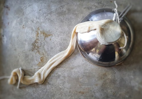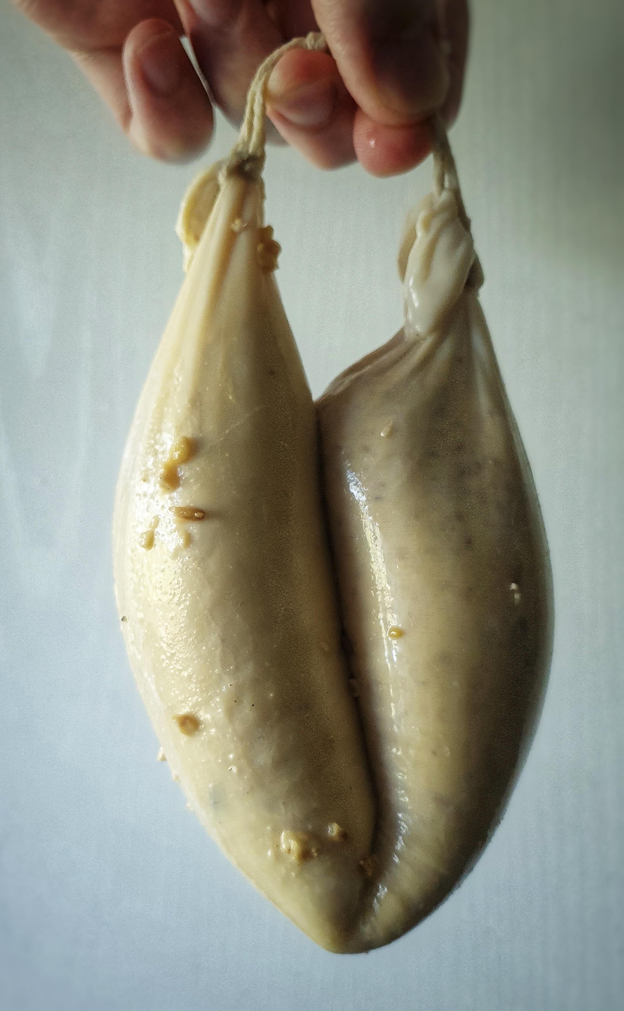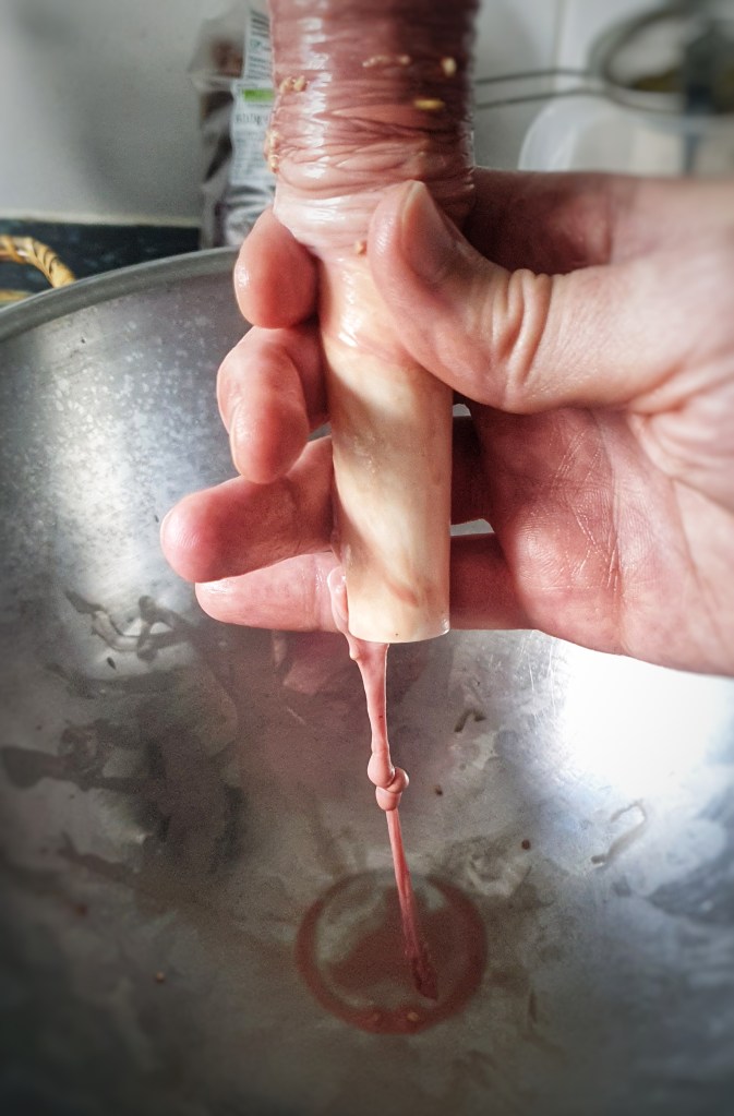 Once everything has had the chance to macerate and absorb, it is time to assemble the puddings. I used my sausage stuffer funnel from the Kitchen Aid and attached a length of pork casing onto it, then secured it with some string and knotted the end. Then I set about filling the casings, a spoon at a time, letting the skins naturally fill and fall into a bowl. Then I tied a link off with some string, making sure the casing wasn’t full and there were no obvious air bubbles. The lengths of the puddings were around 20 cm – though I wasn’t very consistent. In retrospect, I would recommend using beef casings tied to a wide-mouthed jam funnel, much easier to fill and no constant tearing.