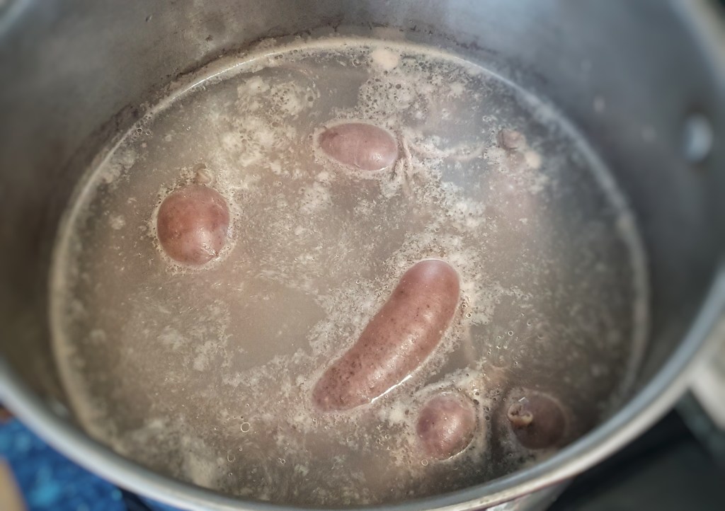 Once all of the mixture is used up, get a large pot of water to a good simmer and gingerly plop them in a few at a time. Three was a good number. Keep the water at a gentle simmer and arm yourself with a pin and pop any bubbles that appear in the cooking puds, lest they burst. They will take around 20 minutes to cook, and you must watch them like a hawk, pin poised and ready to pop. You can tell they are done when the liquid that comes out of a freshly-pricked pudding is clear. If using beef casings, they will take 30 to 35 minutes to cook.