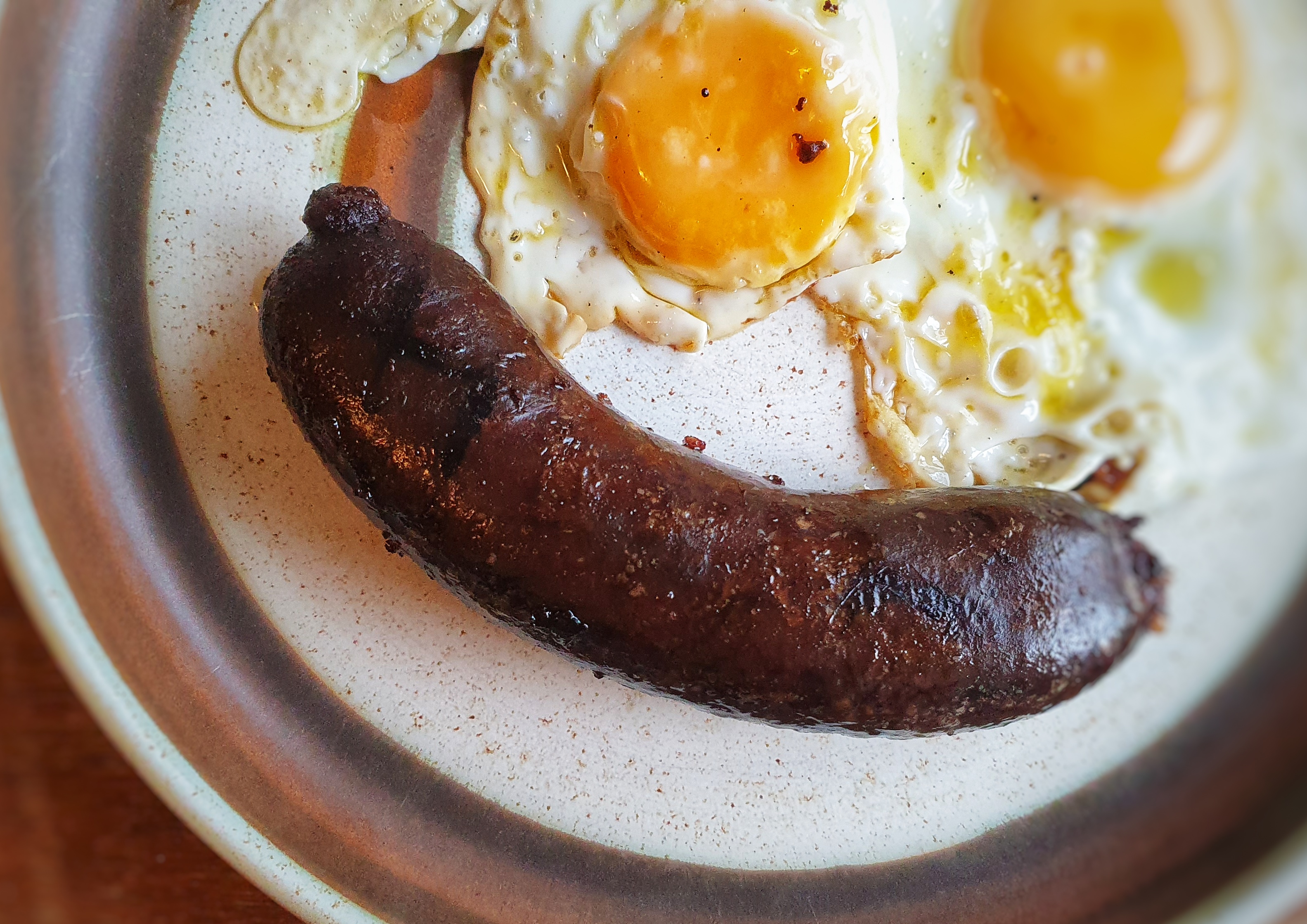 One other thing we talked about was serving suggestions, and of course a slice or two of black and white pudding as part of a full English breakfast is admirable. You can go one better and have the full triple of black pud, white and haggis for a full Scottish! Personally, I believe a slice of fried bread topped with a couple of slices of fried pudding and a poached egg is the breakfast of champions.
