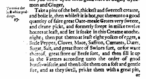 After a great deal of flicking through cookery books, I decided to make Gervase Markham’s white pudding from his classic The English Housewife (first published 1615), mainly because I had most of the ingredients in the house.