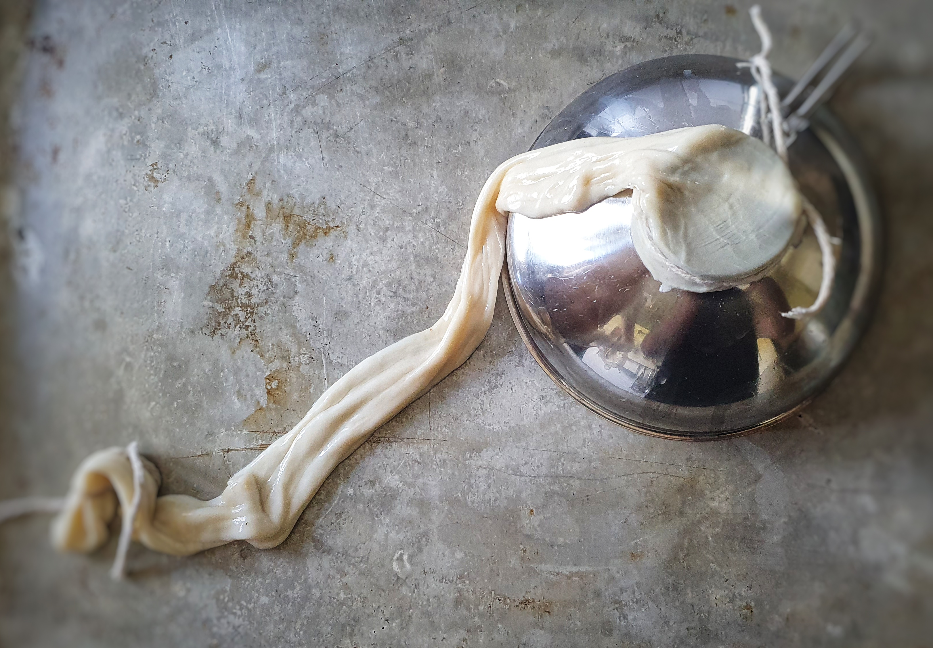 Cut the soaked beef casings into 35 cm lengths and tie the ends securely with string. Now it’s time to attach a funnel to the other end of your first length of gut. I used a jam funnel and secured it with more string.